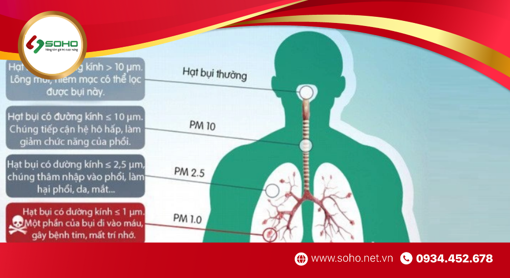 Trong số đó, các hạt bụi mịn với kích thước nhỏ hơn 2,5 micron (PM 2.5) đáng được bận tâm nhất, vì chúng có khả năng xâm nhập sâu vào phổi, ảnh hưởng đến cả hệ hô hấp và hệ thống mạch máu. Tình trạng sức khỏe bị ảnh hưởng của con người có nghiêm trọng hay không sẽ tùy thuộc vào mức độ và thời gian tiếp xúc với không khí ô nhiễm.
