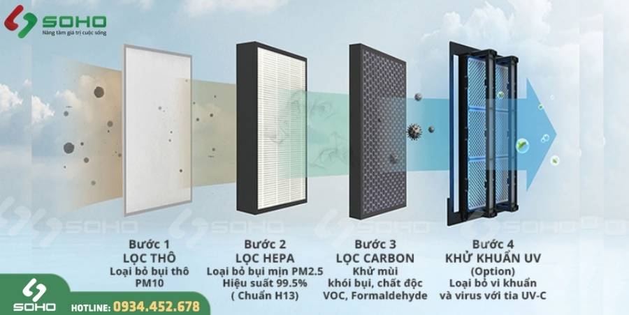 Nhờ được tích hợp màng lọc HEPA và than hoạt tính, máy có khả năng loại bỏ bụi mịn PM2.5, vi khuẩn, VOCs và các chất gây dị ứng - bảo vệ hệ hô hấp và hạn chế các bệnh lý đường thở.