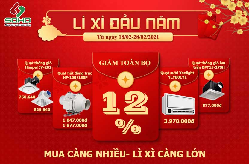 Chương trình lì xì đầu năm 2021 sẽ chính thức bắt đầu từ ngày 18/02/2021 và kết thúc vào ngày 28/02/2021. Toàn bộ các sản phẩm quạt thông gió, quạt sưởi nhà tắm theo danh sách đính kèm ở bài viết này sẽ được giảm giá từ 12% trực tiếp trên hóa đơn mua hàng. Chương trình áp dụng cho toàn bộ khách hàng mua online trên các kênh thương mại điện tử, website, facebook, zalo,... của Soho. Hoặc đến trực tiếp Showroom Soho theo địa chỉ: Số 11/39/106 Hoàng Quốc Việt để trực tiếp xem sản phẩm và mua hàng.