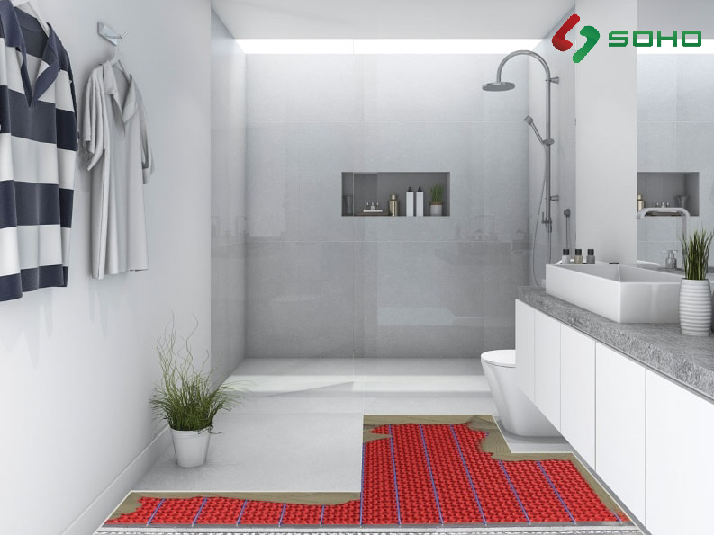 Phòng tắm là một không gian lý tưởng để lắp đặt hệ thống sưởi sàn, bởi lẽ không ai thích bước vào tắm và đứng trên một sàn nhà lạnh ngắt. Bất kể bạn đang ở đâu, gạch luôn có tính lạnh khi chạm vào. Phòng tắm thường có sàn lát gạch, khăn ẩm và nhiều độ ẩm, khiến chúng trở nên rất lạnh – đặc biệt là vào mùa thu, mùa đông và trời nồm khi mà mọi thứ, đặc biệt là trong nhà tắm không thể khô được. Sưởi sàn kết hợp cùng #thang_sấy_khăn trong phòng tắm giúp giữ cho phòng tắm thoải mái quanh năm.