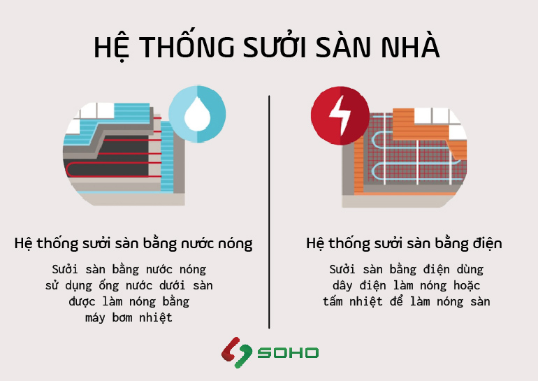 Có 2 loại hệ thống sưởi sàn chính , đó là: hệ thống sưởi nhà bằng điện và hệ thống sưởi nhà bằng nước nóng