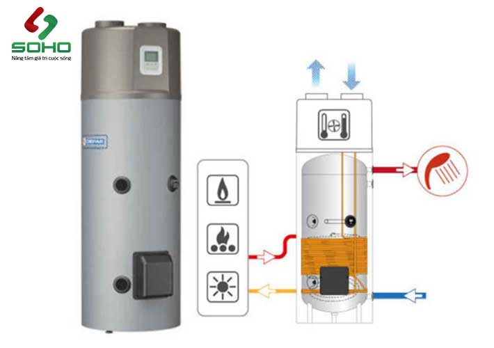Hệ thống bình nước nóng bơm nhiệt bao gồm 4 thành phần chính: dàn bay hơi, máy nén, bình ngưng tụ, van tiết lưu. Với sự luân chuyển nhiệt liên tục theo một vòng tuân hoàn kín: bay hơi (trích xuất nhiệt từ không khí trong môi trường xung quanh) - nén - ngưng tụ (truyền nhiệt làm nóng nước trong bình chứa bảo ôn) - tiết lưu - bay hơi, nhiệt lượng đã được truyền từ không khí tồn tại trong môi trường xung quanh sang cho nước chứa trong bình bảo ôn và làm nóng nước.