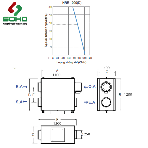 - Vì là dòng máy cấp gió tươi trung tâm với lưu lượng khí cực lớn. Do đó, HRE có kích thước và khối lượng lớn hơn nhiều so với các dòng máy HRD.