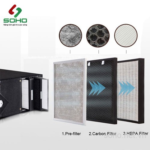 Không khí khi đi vào phòng sẽ đi qua 3 bộ lọc khí: Tấm lọc bụi: loại bỏ bụi, bụi mịn (lọc PM 2.5), màng lọc Carbon: loại bỏ mùi hôi, vi khuẩn, khí độc, màng lọc Hepa, lọc bỏ đến 99.99% bụi siêu mịn, chất độc hại,... Sau đó chia đều đến các mặt gió trong phòng. Cấp thêm nguồn không khí sạch, an toàn cho người dùng và không cần phải sử dụng thêm máy lọc không khí.