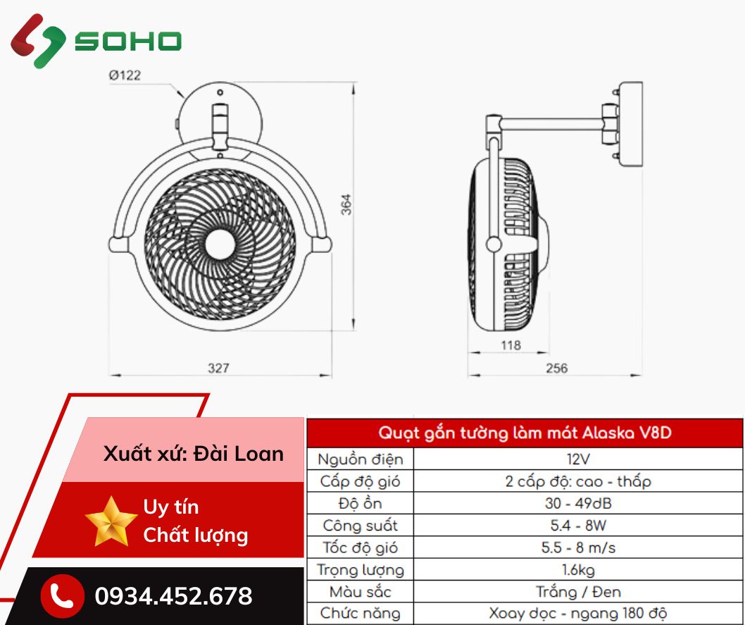 Kiểu dáng của V8D khá nhỏ gọn với lồng quạt và trục tổng đường kính 327mm. Người dùng có thể lắp đặt quạt ở bất kỳ đâu mà không lo ảnh hưởng đến diện tích sử dụng hay việc trang trí nhà cửa. Alaska V8D là dòng quạt gắn tường được thiết kế gọn gàng, tiết kiệm không gian tối đa. Việc lắp đặt không chiếm diện tích sàn/bàn như quạt cây/quạt để bàn, rất phù hợp cho: Phòng ngủ, nhà tắm, phòng ăn, bếp,...