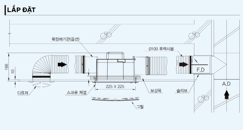 Quạt có kích thước 270x270x244mm với các loại mặt gió khác nhau để lựa chọn. Tùy thuộc vào nhu cầu, sở thích và kích thước của trần thạch cao. Phần cửa gió được thiết kế thêm van ngăn mùi. Khi động cơ nhừng hoạt động, van sẽ hoặt động, đóng kín các cửa gió lại, giúp cho không khí và mùi hôi từ bên ngoài đường ống không tràn vào phòng.