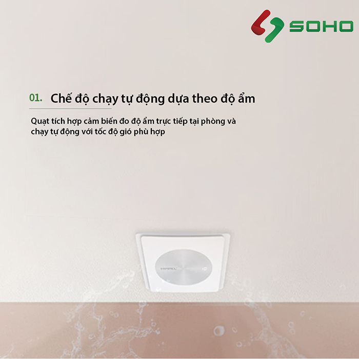 Chưa hết, quạt còn trang bị cảm biến độ ẩm, tự động chạy khi độ ẩm trong phòng vượt quá mức quy định nhằm đảm bảo phòng tắm không sinh mùi, khô ráo cả ngày, đảm bảo sức khoẻ cho gia đình bạn.
