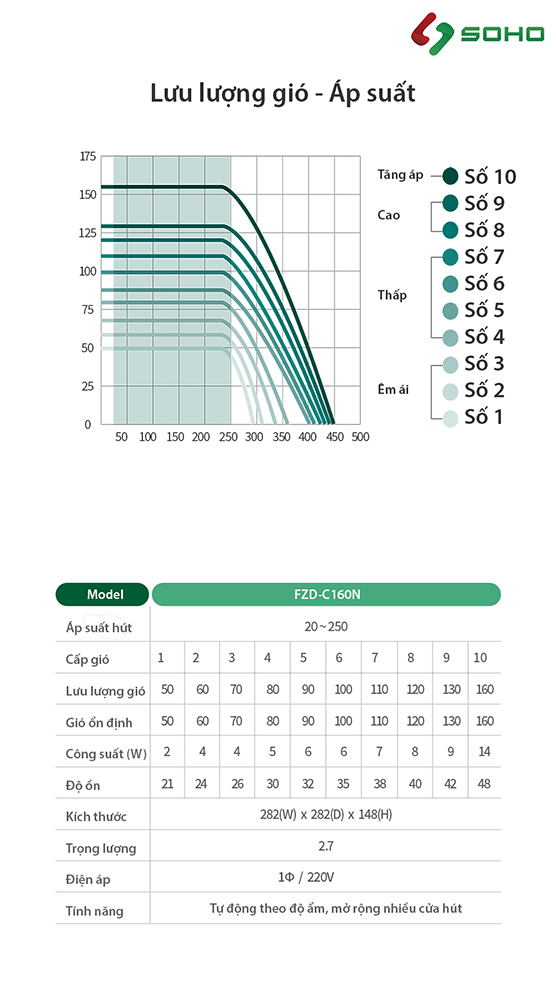 Lượng gió : 50-160 m3/h (10 cấp độ)