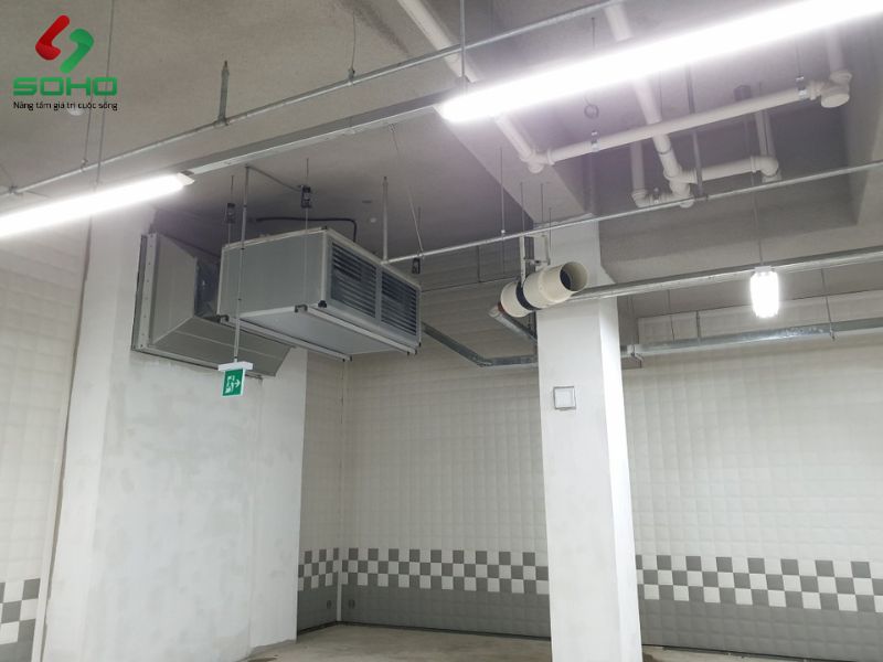 - Hầm để xe, tầng hầm: Cần quạt có lưu lượng lớn và khả năng hoạt động liên tục, như quạt trục tăng áp hoặc quạt hộp tăng áp âm trần, dễ dàng kết nối với ống gió dài.