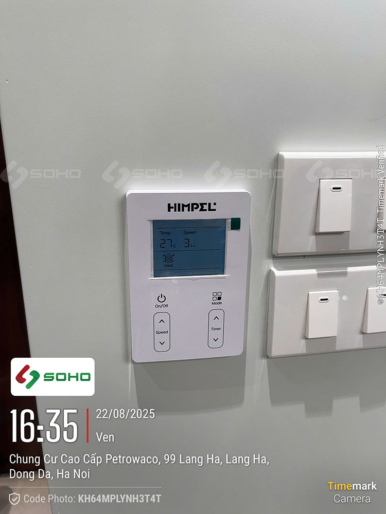Thiết bị được lắp tại căn hộ Láng Hạ là 4 máy cấp gió với mã model HRD-EP250EBN của thương hiệu Himpel (Hàn Quốc). Đây là dòng máy cấp khí tươi nhập khẩu từ Hàn Quốc 100%, 2 chiều cấp gió và hút gió, có tích hợp chức năng thu hồi nhiệt, phù hợp lắp đặt cho nhà ở gia đình, đặc biệt là các căn hộ có diện tích nhỏ và vừa. Tổng diện tích của công trình này rơi vào khoảng 240m2