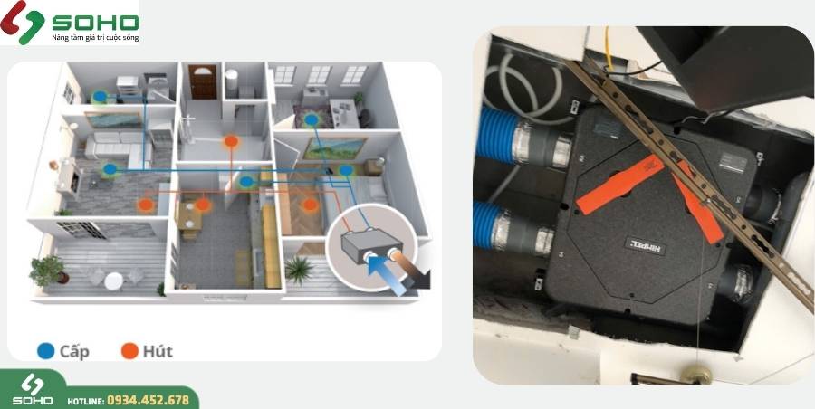 - Hệ thống ống dẫn: dẫn khí tươi đã được xử lý đến các phòng khác nhau trong biệt thự hoặc văn phòng.