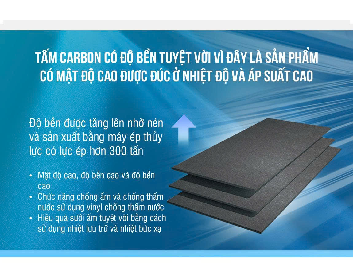 Cấu tạo: 3 lớp với 2 lớp Vinyl Polyester 2 trên dưới và 1 thảm sợi dẫn nhiệt Carbon ở giữa liên kết bằng keo chống nước