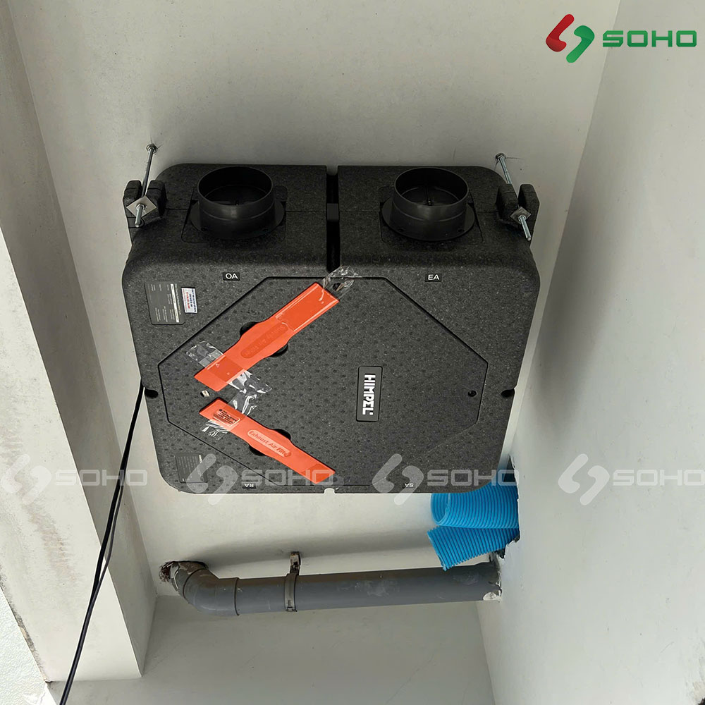 Lắp Đặt Máy Chính: Đặt vị trí và cố định máy cấp khí tươi Himpel (thường là âm trần) đảm bảo vững chắc, cách âm.